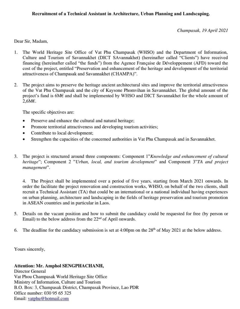 Recruitment of Technical Assistant in Architecture - WHSO Vat Phou
